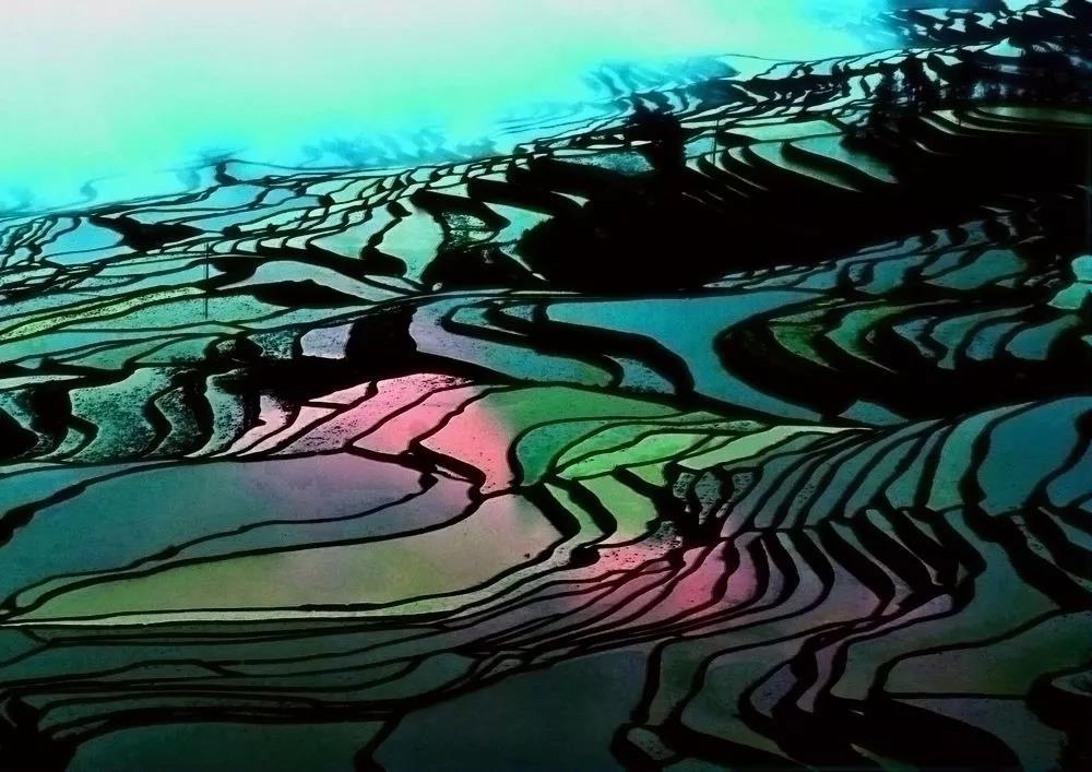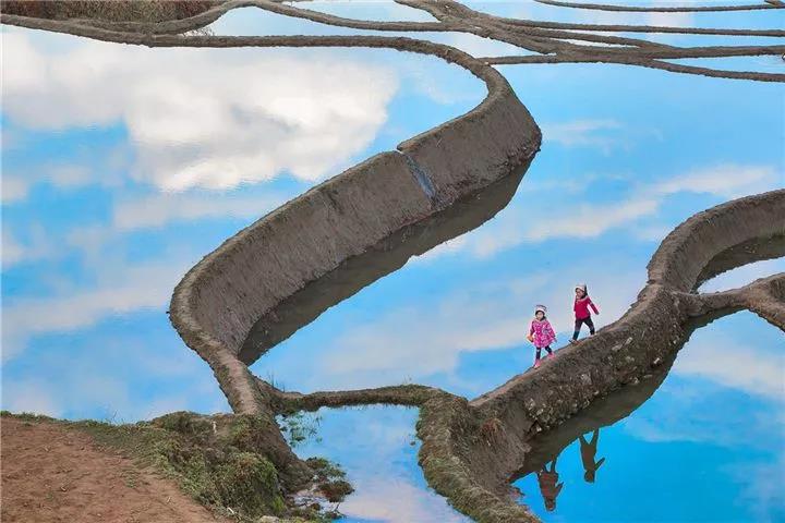 冬日里,灌水期的梯田層層疊疊,夕陽(yáng)斜照,壯美異常。