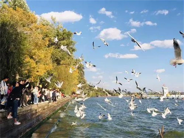 大觀樓,真是一美美四季,春有翠柳拂堤,夏有荷花滿池,秋天百花爭艷,而冬則因紅嘴鷗的到來越發浪漫。