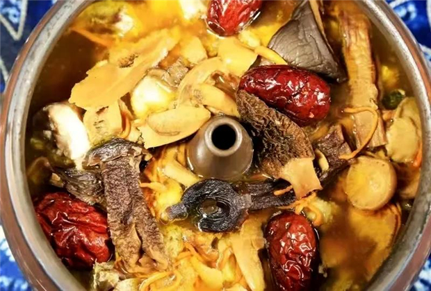 汽鍋是一種以陶為原料制作的鍋,它最妙就在于——以別致的結構,把“蒸”、“燉”這兩種傳統的烹飪方式巧妙地融合,發揮炊具最大的聚能效果,使得雞肉雞湯能夠被放大、最終呈現“本味”的特色。用極少的調味料,烹出“鮮”的味道,絕對是大多數人對汽鍋雞的第一印象。雞湯雖表面略帶油花,但喝起來卻不膩反而鮮美可口,在這寒風瑟骨的冬天,來上一碗滋補暖胃是再好不過的了。