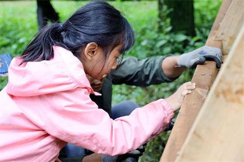 整個木屋是由孩子們一起分工、再合力創造,除了完成自己認領的工程任務之外,還需要合理搭建木制圍欄、屋頂、樹屋裝飾、鳥屋……相互請教、取長補短、互幫互助,這是一個自主溝通的過程。都讓個體與個體之間的連接更加緊密,體驗創造,無疑是對孩子最好的教學。