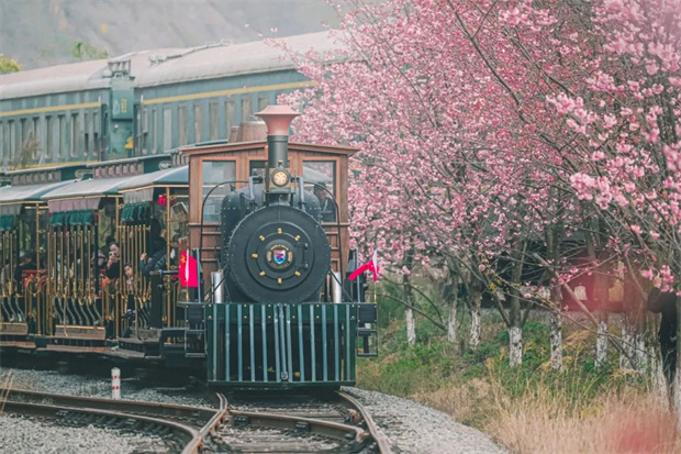 如果你想暢游花海,尋甸鳳龍灣或許是不錯的選擇。乘著時光火車游弋于“落櫻繽紛”的粉色長廊,是這個春日最獨特的