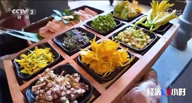 南瓜花,清洗干凈,碼放整齊,色彩搭配也非常講究。八種鮮花加雞湯鍋底,一套鮮花火鍋售價158元。