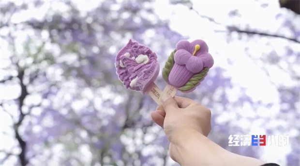 游客來到這里,除了拍照打卡,還被各種各樣的藍花楹主題文創吸引。從胸針到冰箱貼、從冰激凌到絲巾