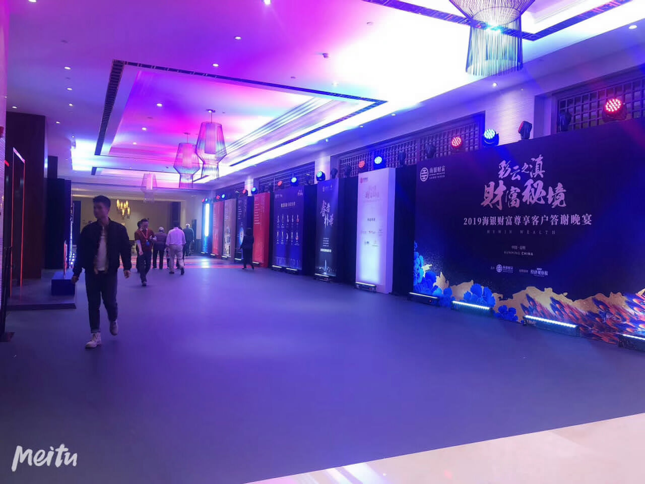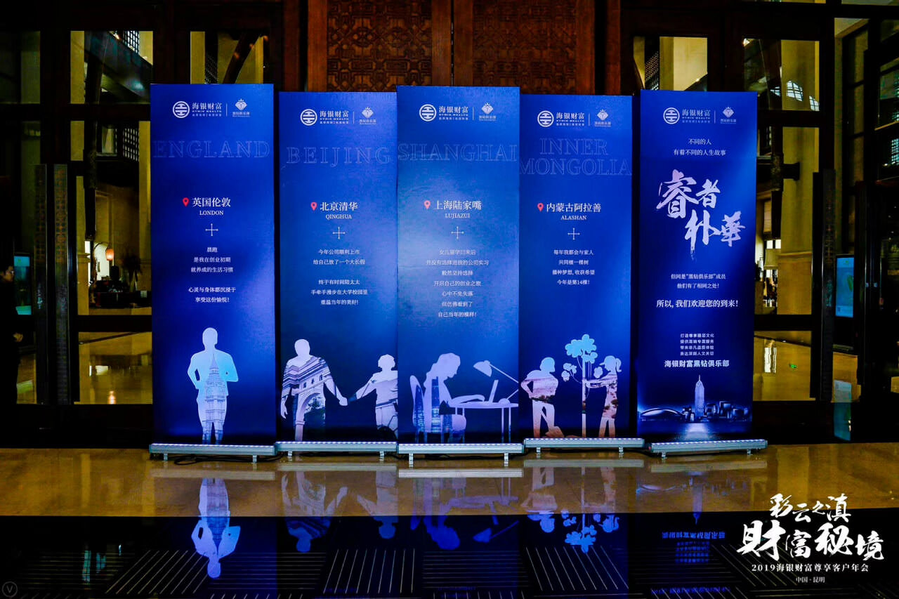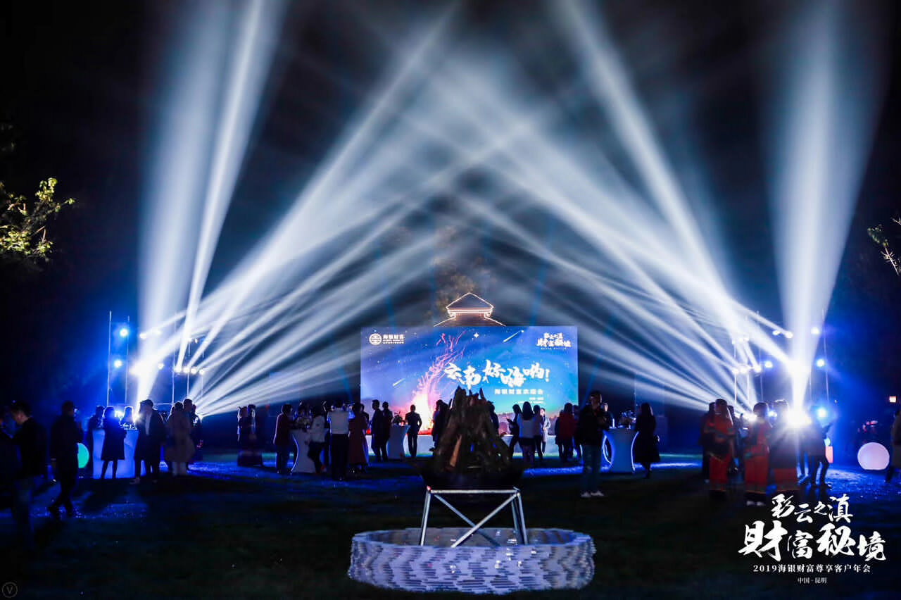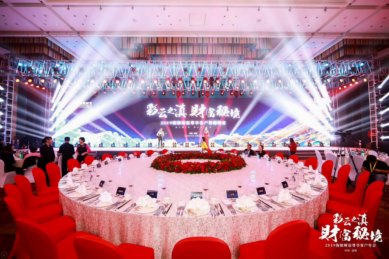 2019年海銀財(cái)富尊享客戶年會及答謝晚宴在滇池湖畔春城昆明召開;天行提供會議會展、獎勵旅游、市場活動管理及包括AV搭建、物料制作、活動場地、演藝、拓展、勞務(wù)人員等專項(xiàng)資源管理在內(nèi)的專業(yè)會展服務(wù)。