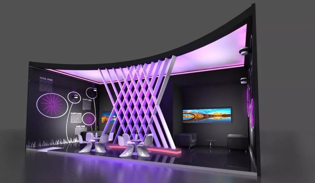不同空間造型形式在整體形態的形式意味表達上是不一樣的。水平序列式組織展位空間,陳列展品同參觀者的“運動”方向相吻合,強調展位沿水平線延展,給人以自然、舒適的視覺感應。豎向式空間造型常常被運用于進深大和層高高的空間里,可隨著景深的變化和垂直方向的高低得到不同的視覺心理感受。三角體空間造型三條邊長度尺寸的變化,會使人產生不同的心理感受。圓形、環形空間造型在空間表現形式上也頗為豐富,可以根據需要進行變形處理,創造出新穎、動感、柔和、親切的展位空間同時也能營造出新奇、科幻般的氣氛。曲線式空間造型具有運動、變化的特征,給人以柔和、輕盈、優美的感受。平緩的曲線給人親和、舒緩的心理感受;不規則起伏的曲線給人流動、動蕩感受等;而有規律變化的曲線,則給人一種柔美的節奏感和韻律美。當然這些空間造型形式并不是孤立存在的,在整體形態的設計上是可以組合和穿插的。?