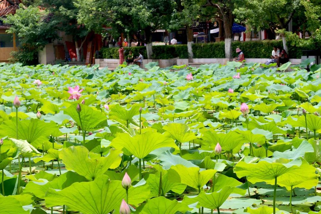 從大門進(jìn)去,一條石板路蔓延至遠(yuǎn)方。道路兩旁的池塘里種滿了荷花,而岸邊也早已站滿了人。