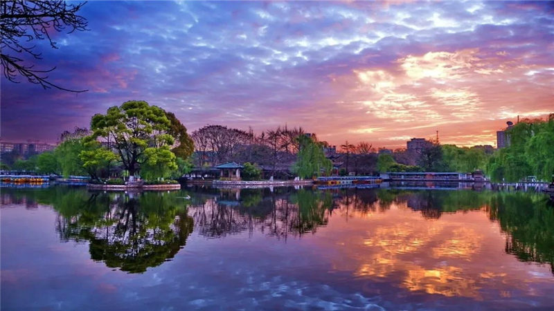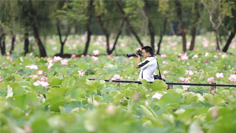 湖內(nèi)種有荷花,夏季來臨時,這里成為人們賞荷花的佳地?!傲潞苫ㄏ銤M湖,紅衣綠扇映清波。”那蓮葉田田,菡萏妖嬈的畫面,被攝影師留在了一張張照片中。