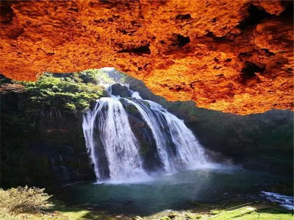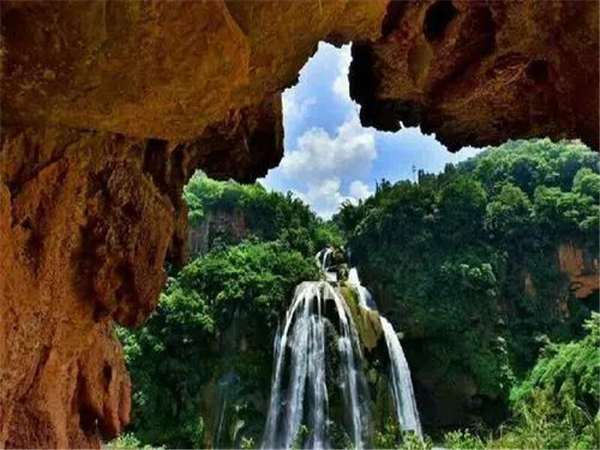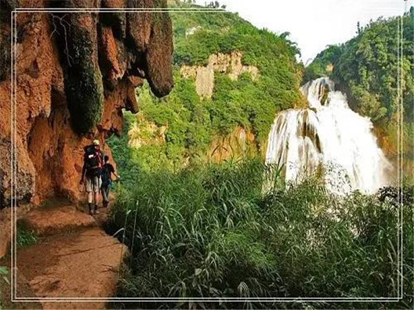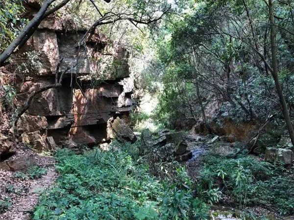 宜良縣城南的月亮谷,自然風光絕美。春日的峽谷內峰巒疊翠,懸崖崛地而起,瀑布與鳥鳴唱和,清泉同蟲聲奏鳴,粗莽的藤條掛在高大的樹木上,樹影遮天蔽日,仿若原始野林。