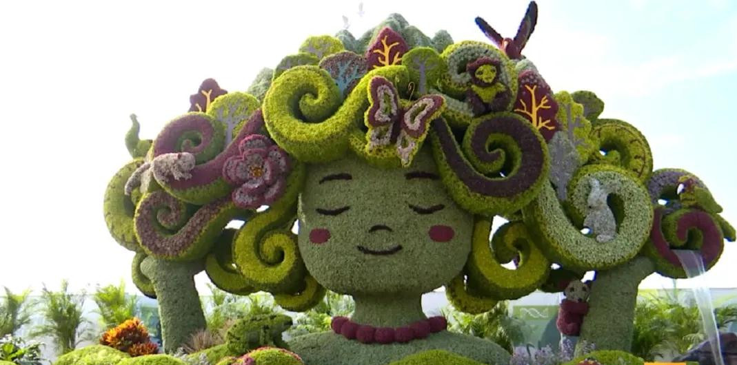 記者:“我身旁的這個(gè)白色的海螺以及一側(cè)的海星都是來(lái)自沿海地帶,那么這些海星其實(shí)并不是一些植物造型,或者是泡沫形成的,這個(gè)是真真切切的一個(gè)海里的生物。那么整個(gè)造型呢,安置在這樣一個(gè)立體花壇上,也是想體現(xiàn)生物、人物、動(dòng)物和植物的一個(gè)共生。