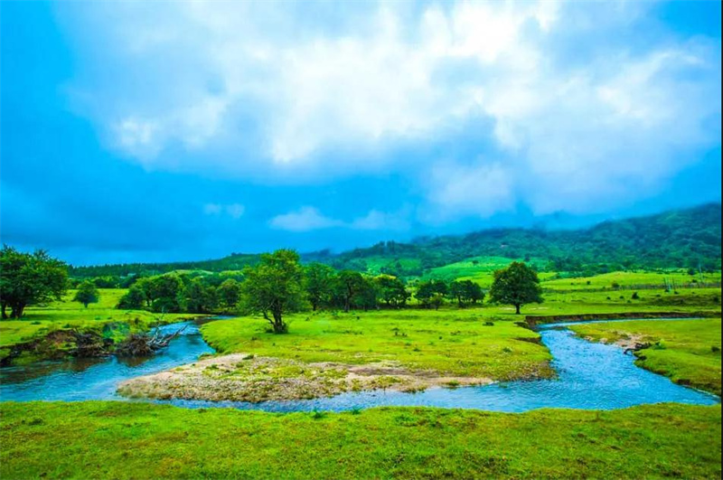 清澈的泉水靜靜流淌在古樹叢林之中,滿山遍野的杜鵑開放在碧綠的草地上,成群的牛羊悠閑自在地在草地上玩耍。