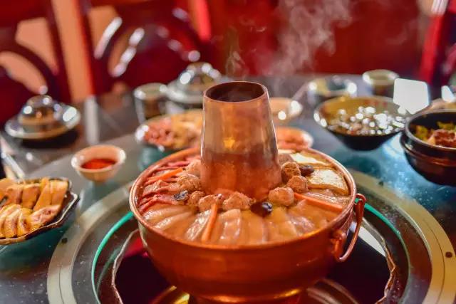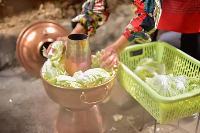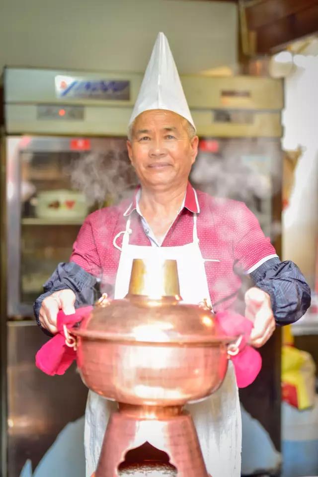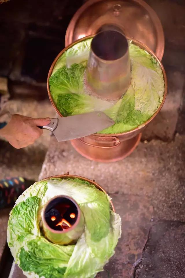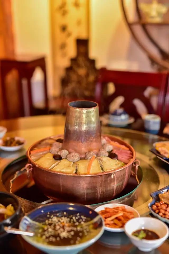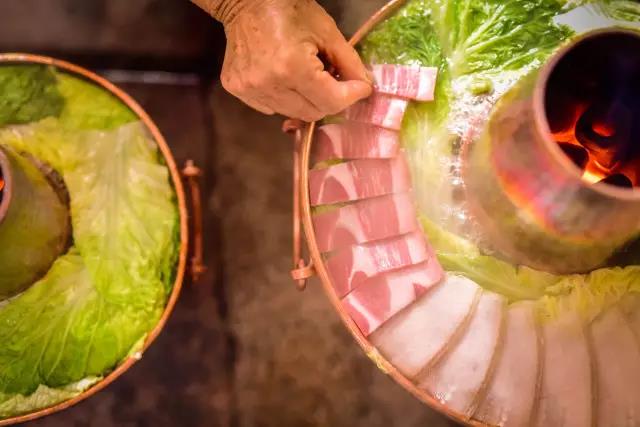 先將熬制好的高湯盛入銅鍋,放入些許鹽、胡椒等調(diào)料,舀入幾勺豬油,蓋上鍋蓋,在煙囪中加入無煙碳生火,等待高湯煮沸。高湯由店主憑借自己幾十年的經(jīng)驗,獨家熬制。“放入土雞、排骨、筒子骨、老鴨同煮,水沸之時,拂去沫子,待用筷子能戳穿肉時取肉,再等雞能被戳穿時,取雞,約一小時許,然后再把筒子骨取出,涼后剔肉,肉涼拌或打蘸水食之。此時湯鮮、色白,可謂高湯。古人無味精,故用雞、骨等熬制成高湯,可當(dāng)味精,故而炊鍋一般不放味精,放適量鹽即可。”馬姐告訴我們,熬制高湯用的都是礦泉水。