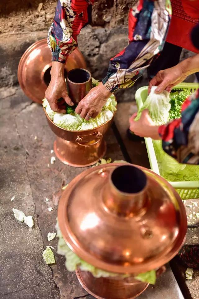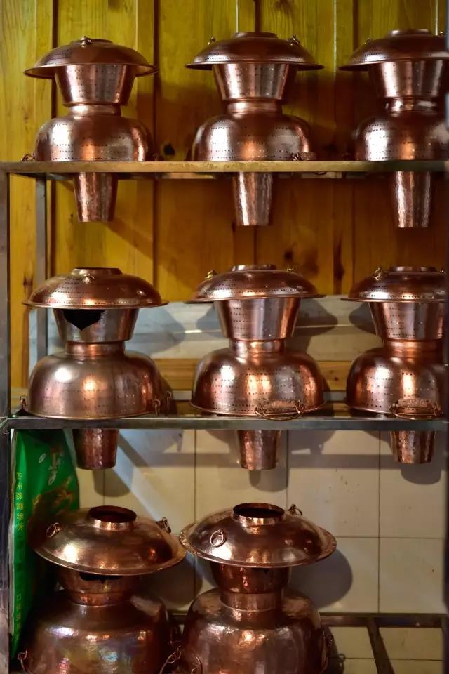 走進食府正房,左右兩邊各擺有餐桌,中央設(shè)有一茶桌、一方桌,方桌上陳列著一口銅鍋。煮通海炊鍋菜用的就是這樣的銅鍋。在古城中心街區(qū),有多家店鋪售賣銅鍋,大大小小的各類銅鍋擺滿店面,最小的銅鍋夠四五人同時食用炊鍋菜,大的足夠十余人使用,有的銅鍋泛著锃亮的光,有的表面則附著一層黑色的“包漿”。