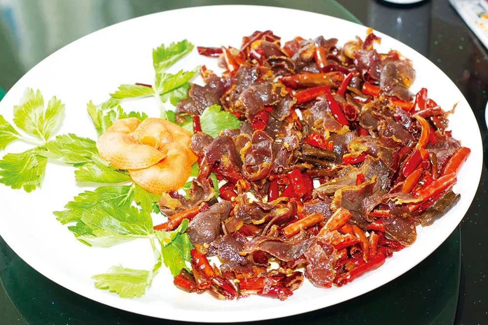 糊辣炒肝是將羊肝片薄,熱鍋溫油炒熟即可。糊辣炒肝一上桌,王天順就提醒我們趁熱吃,這時的炒肝最鮮嫩。
