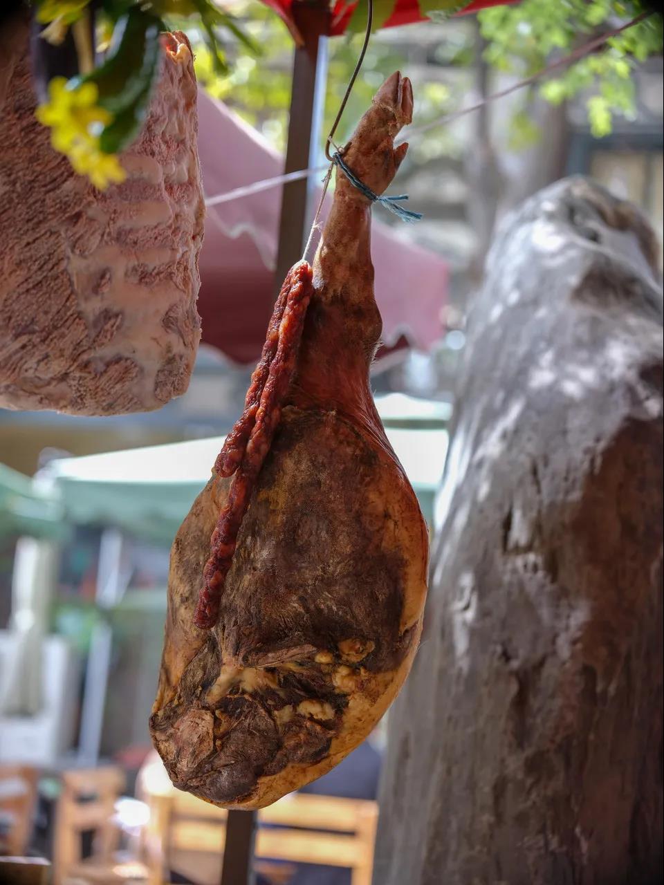 山老腿,顧名思義,就是山里的老火腿,老火腿是指存放一年以上的火腿。