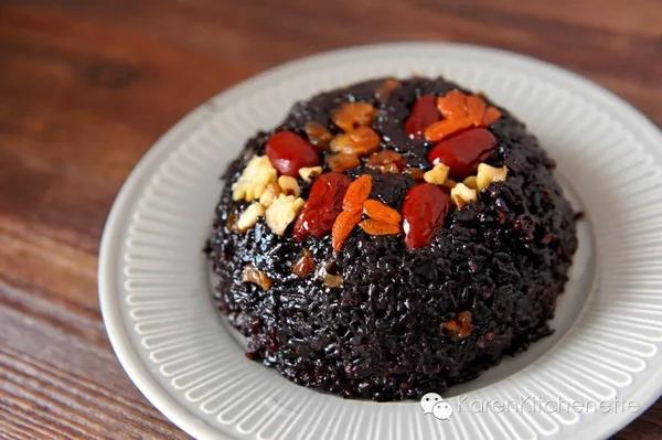 紫米八寶飯因顆粒長、色紫紅,做成飯粥后色更鮮艷,故得名。民間喜在年節喜慶時做成八寶飯食用,味香微甜,粘而不膩,補血益氣,暖脾胃。