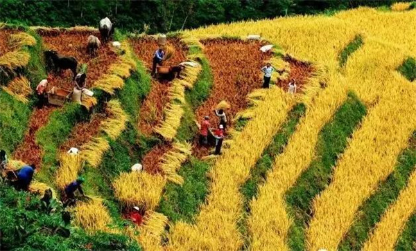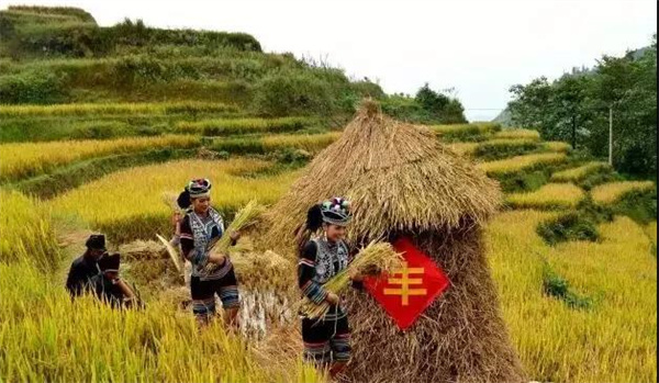 打稻谷的時候,先由老人做個祭祀儀式,打死一只雞獻給天地和稻神,感謝他們給予的豐收。整座山頭,伴著割稻鐮聲一起歡騰了起來。