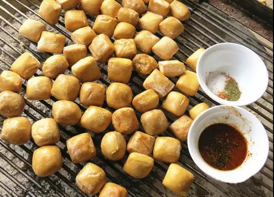 河口的燒烤攤一般就在魚塘不遠,魚是當天的新鮮魚,加上山上現摘的香茅草,野芫荽,蔥姜和醬油腌制30分鐘,上架用櫟碳火烘烤至焦黃上桌,然后沾著用干小米辣和酸醋做的作料吃。